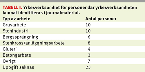 Vi kunde få fram uppgifter om yrkesverksamhet för 48 personer, Tabell I. Bearbetning av berg, vare sig det sker i stenindustri, stenkross eller anläggningsarbete, har varit en viktig orsak till att silikos av klinisk betydelse uppkommit, liksom arbete i gruva. Allvarlig silikos kan också uppkomma i gjuterier där sand används.