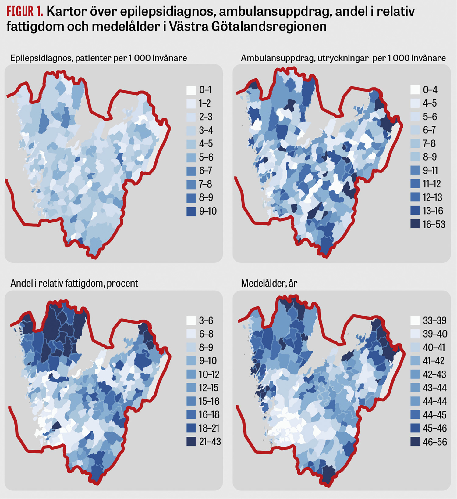 Från ambulanssjukvårdens system Ambulink hämtades information om alla ambulansuppdrag för epileptiska anfall för personer över 16 år under åren 2013–2018 (19 001 stycken). Enheten för samhällsanalys i Västra Götalandsregionen, länkade uppgifterna till socioekonomisk statistik, ursprungligen från SCB, om medelålder och relativ fattigdom, definierad som andelen personer som lever i hushåll vars ekonomiska standard (disponibel inkomst per konsumtionsenhet) är mindre än 60 procent av medianvärdet för riket för 2015. För att justera för epilepsiförekomst beställdes avidentifierad statistik från Socialstyrelsens nationella patientregister om antal levande personer per församling med en epilepsidiagnos (ICD-kod G40) registrerad i Patientregister öppenvård eller slutenvård 2014–2015. Tidpunkten valdes på inrådan av Socialstyrelsen, eftersom det fanns ett stort bortfall av geografiska koder i den inrapporterade statistiken från 2016 och framåt, då Patientregistrets geografiska indelning övergick från församlingar till distrikt. Förekomst av G40 är den rekommenderade definitionen av epilepsi i studier av administrativa data enligt den internationella epilepsiorganisationen ILAE och har validerats i det svenska patientregistret [14, 15].