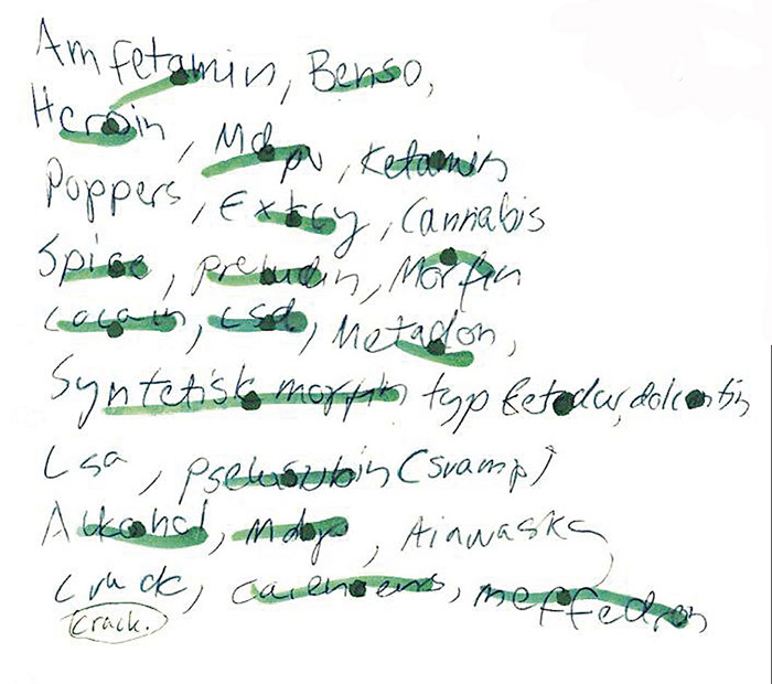 Figur 1. Information från en intervju (23 oktober 2012) där en öppen fråga ställts om vilka droger som använts. Den intervjuade (man född 1983) skrev ned de preparat som han spontant mindes och prickade därefter med grön tuschpenna för dem som injicerats.