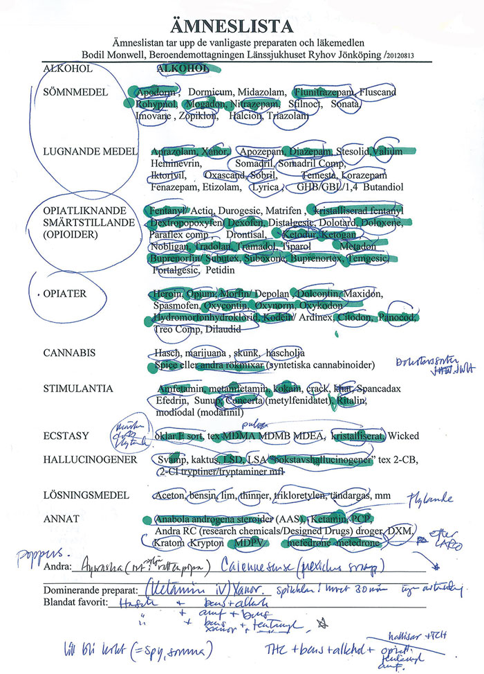 Två av författarna (BM/OB) arbetade 2011 fram en ämneslista som omfattade kända missbrukspreparat. Som utgångspunkt fanns ADDIS ämneslista uppdaterad med droger kända från klinisk verksamhet [19]. I några fall ändrades gruppindelningen baserat på farmakologiska effekter. Drogerna presenterades under alla förekommande preparatnamn, eftersom de kan vara kända på olika sätt. Ämneslistan kontrollerades med dels kolleger på beroendeenheten, dels andra professionella inom det lokala nätverket för monitorering av drogsituationen på orten. I nätverket ingår ett 15-tal personer från polis, sjukvård, skola, fritidsförvaltning, socialtjänst, Statens institutionsstyrelse och kriminalvård. En av författarna (BM) har därefter i samband med utredning av opioidberoende (med opioider avses hela gruppen naturliga »opiater« och halv-/helsyntetiska opioider enligt ICD-10:s definition) patienter inför behandling eller vid uppföljning tagit upp anamnes i två steg. Först fick patienten efter en enkel öppen fråga skriva ned de droger som missbrukats och därefter markera vilka av dem som injicerats (Figur 1). I nästa steg fick patienten på ämneslistan markera vilka droger som missbrukats samt pricka för vilka som injicerats (Figur 2). Patienten ombads att ta med eventuella legalt förskrivna preparat men endast dem med vilket patienten sökt ett aktivt rus, då felaktiga doser använts för att nå rus eller då preparaten intagits på annat sätt än rekommenderat, t ex nasalt eller intravenöst.