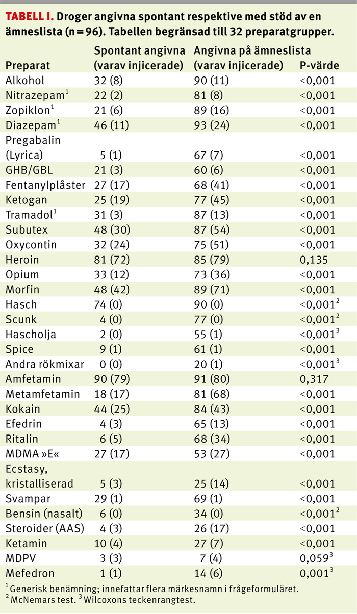 Tabell I visar skillnaden i utfall mellan spontant angivna droger och droger angivna med kognitivt stöd. Resultatet visar signifikanta skillnader mellan de två anamnesupptagningsmetoderna avseende 85 av 91 preparatgrupper sedan generika för olika bensodiazepiner och tramadolgruppen slagits ihop gruppvis. För fyra drogtyper som varit aktuella för ett mycket litet antal personer (n < 10, oavsett rapporteringsmetod) nåddes inte statistisk signifikans (P = 0,06–0,08). Av övriga drogtyper som kunde prövas visade endast heroin (P = 0,14) och amfetamin (P = 0,32) inte någon signifikant skillnad. Undersökning med stöd av ämneslista gav i denna studie således en betydligt högre andel positiva svar. 92 procent angav opioider som huvuddrog, vilket kan förväntas i en population som sökt substitutionsbehandling för opioidberoende. Endast 3 procent angav bensodiazepiner som huvuddrog, 1 procent angav amfetamin och samma andel angav cannabis. 2 procent angav att de inte hade en huvuddrog utan hade missbrukat urskillningslöst. Endast 6 procent uppgav att de endast använder ett preparat. Av dem som ombads ange »favoritmix« uppgav 28 procent att de inte ville blanda flera preparat vid samma intagstillfälle, medan 23 procent blandade opioider med bensodiazepiner, 20 procent blandade opioder med centralstimulantia och 7 procent blandade opioider med cannabis. Övriga använde andra blandningar av två eller fler preparat.