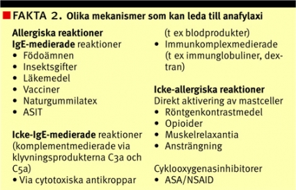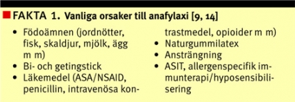 Födoämnen är den vanligaste orsaken till anafylaxi. Mycket tyder på att det är ett växande problem, där allergi mot jordnötter och nötter dominerar [13]. Insektsgifter kommer därnäst som orsak till anafylaxi. De vanligaste orsakerna till anafylaxi sammanfattas i Fakta 1. Läkemedel är välkända orsaker till anafylaxi. En annan orsak, som ökat de senaste decennierna, är allergi mot naturgummilatex, sannolikt orsakat dels av ökad användning av naturgummihandskar hos sjukvårdspersonal, dels av ökad allergiförekomst. Mer ovanliga orsaker inkluderar ansträngning, vacciner och sädesvätska. ASIT (allergenspecifik immunterapi/hyposensibilisering) medför också risk för anafylaxi.