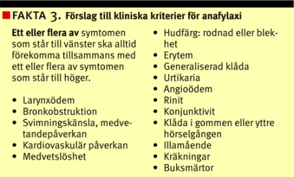Dessvärre är ingen av ovannämnda definitioner användbar i klinikerns vardag. Därför kan en god arbetsdefinition vara att anafylaxi är en svår systemisk överkänslighetsreaktion som innefattar ett eller båda av två svåra symtom: andningssvårigheter (kan vara orsakade av larynxödem eller astma) och cirkulatorisk påverkan (kan visa sig som ostadighet, hypotension, medvetandepåverkan eller medvetslöshet) [4]. Enbart generaliserad urtikaria, angioödem eller rinokonjunktivit betyder således inte att anafylaxi har förelegat, om inte andningssvårigheter eller kardiovaskulär påverkan har förekommit [4, 9].
