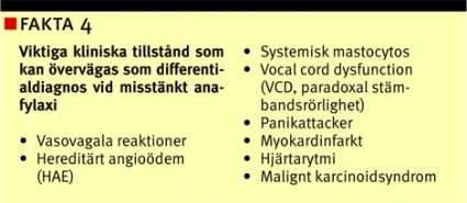 Vid anamnes på kontakt med känt utlösande agens är vanligen diagnosen anafylaxi uppenbar. Manifestationer från huden med urtikaria, klåda och angioödem kan stödja diagnosen. Om symtom från gastrointestinalkanalen dominerar eller om det är svårt att ta anamnes på grund av akuta besvär från hjärt–kärlsystemet eller lungorna, kan anafylaxi förväxlas med andra sjukdomstillstånd. Några viktiga differentialdiagnoser återges i Fakta 4.