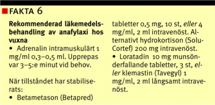 När patientens tillstånd stabiliserats med adrenalin kompletteras den initiala behandlingen med antihistamin och kortikosteroider för att motverka återfall. Fakta 6 sammanfattar schematiskt behandlingen hos vuxna.