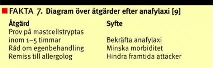 Specialistbedömning rekommenderas sedan patienten behandlats för misstänkt anafylaxi, för att finna eller fastställa utlösande orsaker, för att ge råd om adekvata försiktighetsåtgärder och för att ta ställning till eventuell immunterapi. Fakta 7 sammanfattar vad som ska göras efter anafylaxi.