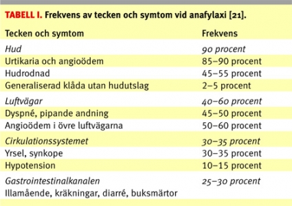 Symtomen vid anafylaxi visar sig framförallt i huden, gastrointestinalkanalen, luftvägarna och kardiovaskulära systemet. Tabell I visar symtomfrekvensen baserat på en sammanställning av 1865 patienter [21]. Generaliserad urtikaria och angioödem är de vanligast förekommande manifestationerna vid anafylaxi. Patienterna beskriver ofta en initial känsla av hotande undergång, följt av klåda och hudrodnad. Vid snabbt progredierande anafylaxi kan dock hudsymtomen dröja eller saknas helt [15].