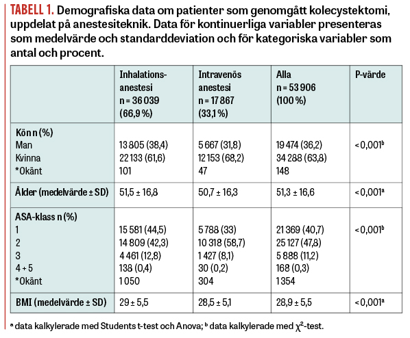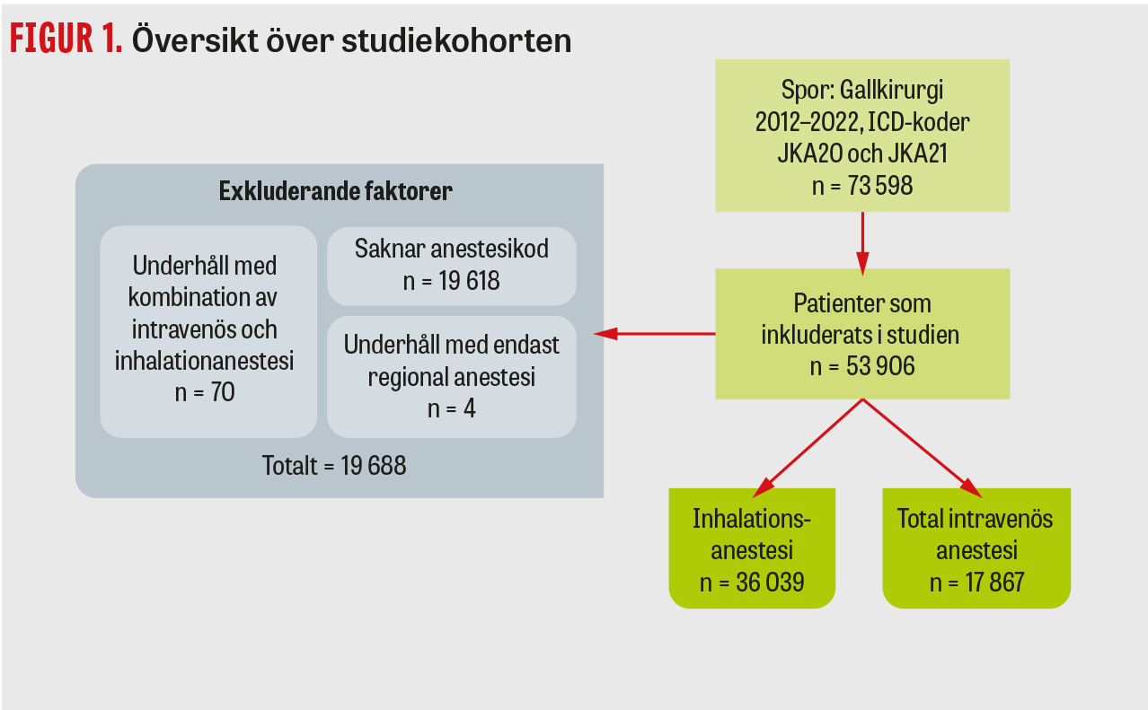 Denna registerbaserade studie använde Spor som datakälla. Alla kolecystektomier registrerade mellan år 2012 och juni 2022 på patienter 18 år och uppåt i Sverige kom att ingå i kohorten. Totalt identifierades 53 906 kolecystektomier, uppdelade på 36 039 inhalationsanestesier och 17 867 totala intravenösa anestesier (Figur 1). Anestesityp identifierades genom koder från Svensk förening för anestesi och intensivvård. En jämförelse av patientdemografi, perioperativt tidsförlopp och 30-dagarsdödlighet gjordes mellan anestesigrupperna. Studien är godkänd av etikprövningsnämnden (dnr 2022-02521-02).