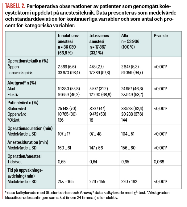 64 procent av kolecystektomierna utfördes på kvinnor, genomsnittsåldern totalt var 51 ± 17 år och 89 procent av patienterna hade ASA-klass 1 och 2 (se Tabell 1). 46 procent av operationerna gjordes akut och 95 procent laparoskopiskt. 38 procent av de registrerade kolecystektomierna gjordes som dagingrepp (se Tabell 2). Inhalationsanestesi användes vid 67 procent av alla ingrepp, och i högre utsträckning för kolecystektomier som gjordes inom sluten vård och vid akuta ingrepp. Operations- och anestesitiden var kortare vid total intravenös anestesi (ungefär 10 minuter). Trots att inhalationsanestesi användes mer hos patienter med högre ålder och ASA-klass samt vid akuta ingrepp, och hade en längre operationstid, hade denna grupp genomsnittligt kortare vistelse på uppvakningsavdelningen (8 minuter; P < 0,001) (Tabell 2).
