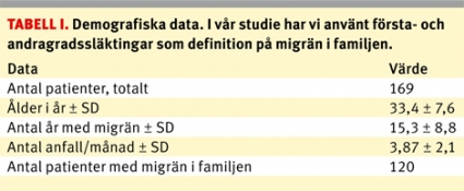 I vår studie har vi använt första- och andragradssläktingar som definition på migrän i familjen. Tre personer uppgav inte om de hade släktingar med migrän. Det var signifikant fler av dem som hade migrän i familjen som svarade att det fanns utlösande faktorer vid mer än 50 procent av anfallen, dvs 92/104 jämfört med 28/42 (P=0,003) av dem som inte hade migrän i familjen.