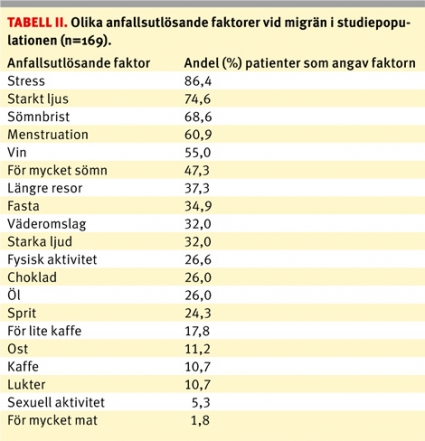 Resultaten jämfördes med resultat från tidigare publikationer. Dessa hittades genom en osystematisk sökning i PubMed med söktermerna »migraine«, »precipitating factors«, »migraine and trigger factors«, »wine and migraine« och »menstruation and migraine«.