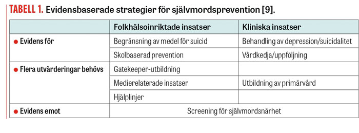 Självmordsbeteende är komplext och svårt att förutsäga; i dagsläget finns ingen tillförlitlig metod som med vetenskapligt stöd kan förutse suicid i den psykiatriska vården [7, 8]. Emellertid visar systematiska litteraturgenomgångar att det har utvecklats en rad suicidpreventiva metoder och åtgärder med god evidens på befolkningsnivå och individuell nivå inkluderande psykosociala interventioner för självskadebeteende (inklusive självmordsförsök) bland både barn/ungdomar och vuxna [9, 10]. Evidensen har studerats med hänsyn tagen till hälso- och sjukvårdsåtgärder och befolkningsinriktade åtgärder (Tabell 1).
