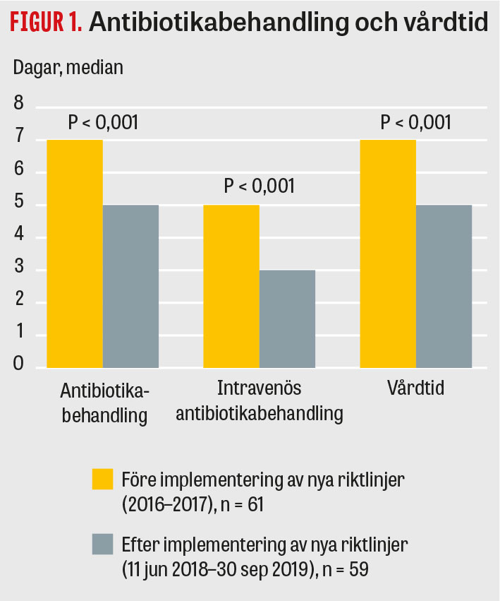 Resultaten visar att tiden med antibiotikabehandling och vårdtiden minskade och sjukvårdskostnaderna reducerades (1,27 miljoner kr/år) i gruppen som uppfyllde de nya behandlingsriktlinjerna (Figur 1), utan att det förekom någon reinfektion inom tre dagar efter avslutad antibiotikabehandling eller död inom 30 dagar.