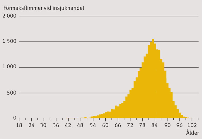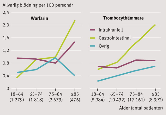 I frågan om huruvida antikoagulantia ska sättas in eller inte spelar åldern en viktig roll. Åldern påverkar risken för både stroke och blödning kontinuerligt, inte dikotomt vid 65 års ålder som i t ex HAS-BLED. Strokepatienterna är i genomsnitt betydligt äldre, 80 år, än de som ingått i de stora studierna av nya och äldre antikoagulantia (Figur 3). För närvarande finns blödningsdata från hela gruppen av hjärninfarkter, dvs även de som inte har förmaksflimmer. Dessa data visar att risken för blödning, i synnerhet intrakraniell och gastrointestinal, ökar mer efter 75 års ålder (Figur 4) [15]. Ökningen av blödningsrisken efter 75 års ålder kan vara relaterad till förekomst av småkärlssjuka. På DT syns småkärlssjuka som lakunära hjärninfarkter och förlust av vitsubstans (leukoaraios) (Figur 5). Med MRT kan man dessutom se mikroblödningar i hjärnparenkymet. Småkärlssjuka är även relaterad till större hjärnblödningar. En omfattande litteratur finns på området [16].