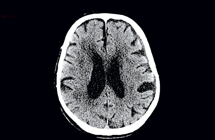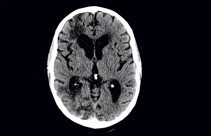 Figur 5. 86-årig kvinna med förstagångsstroke och förmaksflimmer. DT-hjärna visade förekomst av småkärlssjuka med förlust av vitsubstans, leukoaraios (mörka områden bredvid sidoventriklarna).