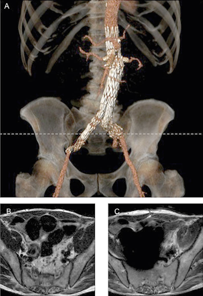 En grupp på 22 patienter som mellan juni 1996 och december 2005 genomgått endovaskulär operation av abdominellt aortaaneurysm där man använt stentgraft tillverkade av rostfritt stål typ 304 och som genomgått MR-undersökning, trots att man instruerat patienterna att inte göra det, identifierades och erbjöds att delta i en studie [8]. 17 personer gav sitt samtycke och fick sina journaler granskade. 11 hade någon typ av Zenith stentgraft. Patienterna tillfrågades om smärta i buk och/eller rygg i anslutning till MR-undersökningen. För att identifiera eventuella förändringar i struktur, position eller flödesöppenhet jämfördes DT- och konventionella röntgenundersökningar före och efter MR-undersökningen.