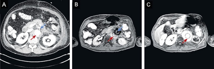 Figur 2. Patient behandlad med EVAR. Stentgraft av nitinol. A: Axialt snitt från DT-undersökning. Röd pil = stentgraft, blå pil = metallclips. B: Axialt snitt från MR-undersökning i motsvarande läge. Det framgår tydligt att clipset ger upphov till kraftigare störningar än stentgraftet. C: Axialt snitt från MR-undersökning något kranialt om de två andra snitten. MR-bilderna togs vid 1,5 T med en THRIVE-sekvens efter kontrastinjektion.