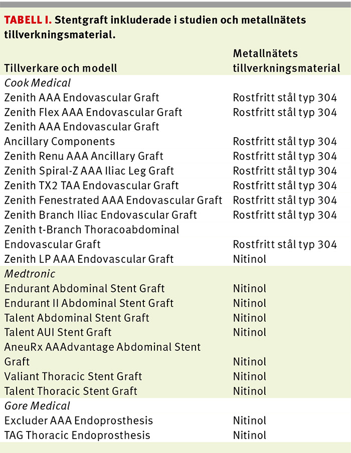 Data gällande implantat identifierades (Tabell I). Dessutom fastställdes vilken sjukhusavdelning som utfört implantatationen och vilka kontaktpersoner som representerade berörda enheter. Litteratursökningen gjordes inledningsvis i PubMed och Google Scholar med sökorden »Zenith Stent Graft MRI« och utökades genom att följa referenserna i de artiklar och leverantörsdokument som påträffades. Litteratursökningen resulterade i fem artiklar. Ur den initiala sökningen selekterades dessa artiklar med villkoret att de behandlade ämnet »säkerhet vid MR-undersökning«.