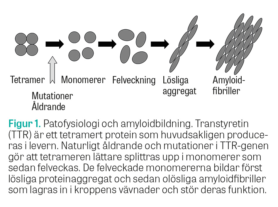 ATTRv-amyloidos är en autosomalt dominant monogen sjukdom som orsakas av mutationer i genen som kodar för proteinet transtyretin (TTR). I dag finns över 120 kända mutationer i TTR-genen [4]. Majoriteten av dessa mutationer är sjukdomsorsakande och ger en instabilitet i transtyretintetrameren, som lättare splittras upp i monomerer, som i sin tur bildar amyloid (Figur 1). Transtyretin syntetiseras främst i levern men även lokalt i ögat och i det centrala nervsystemet. Amyloidinlagringen kan i princip ske i hela kroppen, men orsakar kliniska symtom främst från det perifera nervsystemet, mag–tarmkanalen, urinvägarna, hjärtat och ögat. Sjukdomens fenotyp beror delvis på genotypen, men variationer finns också inom samma genotyp, där typen av amyloidfibriller (typ A eller B) är betydelsefull för sjukdomens fenotyp och prognos, då typ A-fibriller är associerade med amyloid kardiomyopati medan typ B-fibriller inte är det [5].