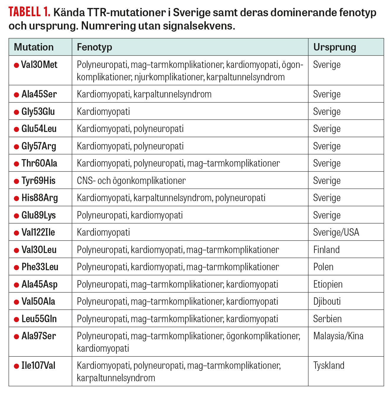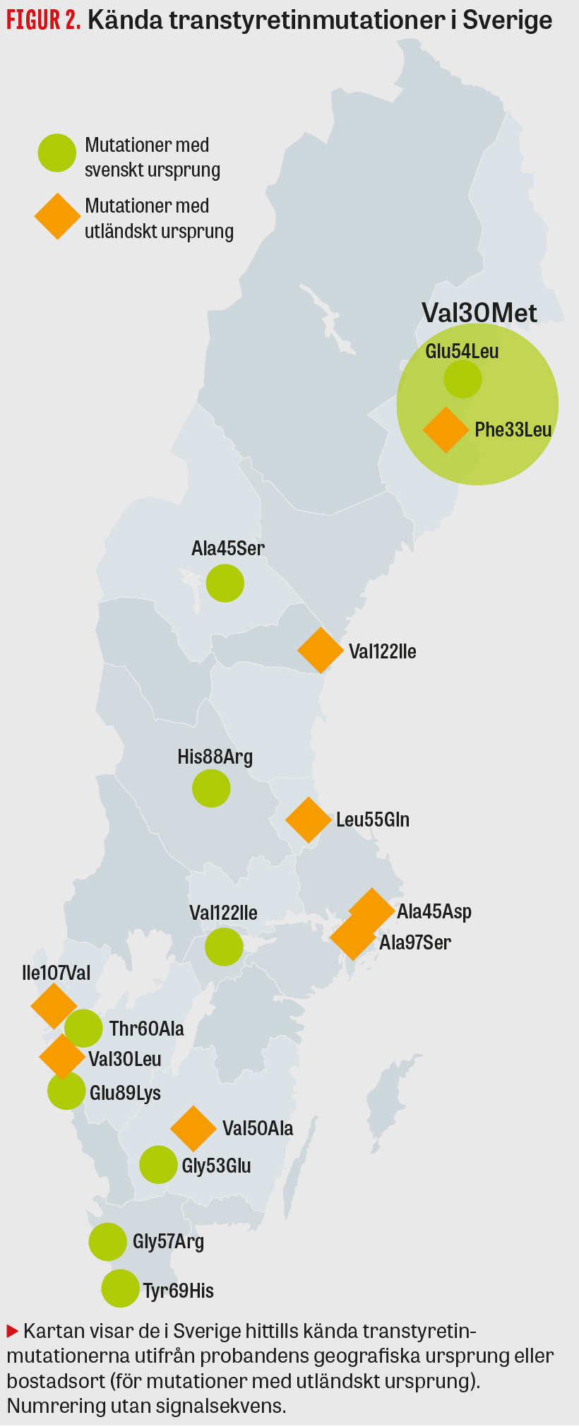 ATTRv-amyloidos är en sällsynt sjukdom som förekommer över hela världen. Den vanligaste patogena mutationen i Europa, Val30Met (p.Val50Met), är dock vanligare i vissa så kallade klusterområden i bland annat Sverige, Portugal och Japan. Globalt finns ca 10 000 patienter med sjukdomen, och den högsta prevalensen återfinns i Portugal med runt 2 000 patienter på 10 miljoner invånare [6]. Den högsta beskrivna anlagsbärarfrekvensen på 2 procent finns dock i Sverige (Västerbotten), och i dag beräknas omkring 8 000 anlagsbärare finnas i vårt land [7]. Den ofullständiga penetransen (43 procent vid 70 års ålder) [8] gör dock att antalet patienter som lever med sjukdomen i Sverige beräknas till ca 400, varav merparten (75 procent) bor i Norrbotten och Västerbotten. Ungefär 30 nya sjukdomsfall diagnostiseras årligen. En stor andel patienter och anlagsbärare härstammar från Skellefteåtrakten, varför sjukdomen ofta går under namnet Skelleftesjukan. Utöver Val30Met-mutationen, som står för 95 procent av alla sjukdomsfall i Sverige [9], finns 16 andra mutationer med svenskt eller utländskt ursprung beskrivna i landet (Tabell 1 och Figur 2) [10].
