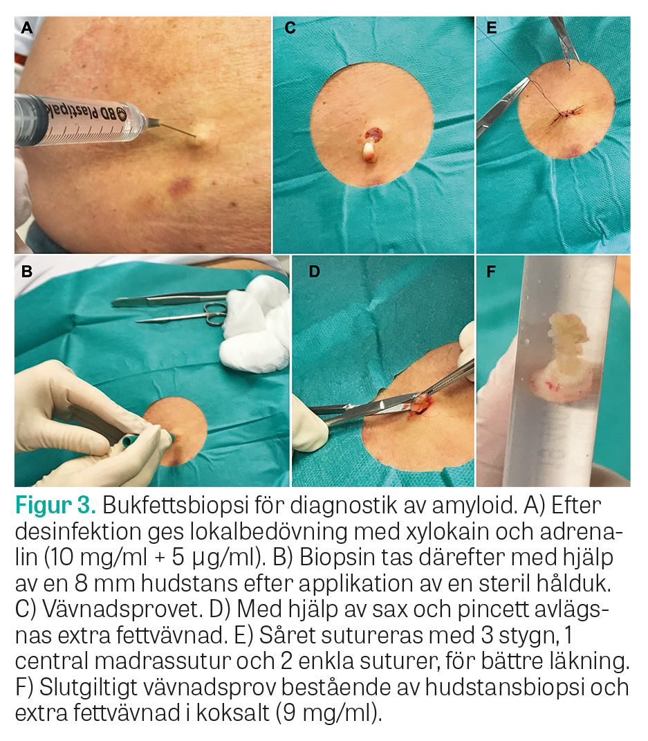 Hörnstenen i diagnostik av all amyloidos är att påvisa amyloid i vävnadsbiopsier som färgas med Kongorött och undersöks i polarisationsmikroskop. Påvisade amyloidinlagringar, sjukdomstypiska symtom och förekomst av TTR-mutation krävs för att ställa diagnosen ATTRv-amyloidos. Vid ATTRv-amyloidos är bukfettsbiopsi en träffsäker diagnostisk metod [12] som utgör förstahandsval (Figur 3), men biopsier från mag–tarmkanal, hjärta eller njure är gångbara alternativ. Vävnadsprov för amyloiddiagnostik skickas primärt till Klinisk patologi vid Akademiska sjukhuset i Uppsala, som specialiserat sig på denna diagnostik. DNA-analys av TTR-genen görs vid de kliniskt genetiska enheterna vid Sveriges universitetssjukhus och ska föregås av genetisk vägledning. Vid misstänkt ATTR-amyloidos bör DNA-analys utföras frikostigt, då ATTRwt-amyloidos är svår att skilja från ATTRv-amyloidos av typ A. Vid misstanke om amyloid kardiomyopati kan skintigrafi med teknetium-99m-märkt DPD (butedronsyra) ersätta vävnadsprov för diagnostik, så länge AL-amyloidos har uteslutits [16]. Vid minsta tveksamhet ska dock vävnadsbiopsi tas, då bilden vid ATTR- och AL-amyloidos kan vara snarlik [17]. Utöver detta bör patienterna undersökas utifrån klinisk bild med exempelvis neurofysiologiska test, EKG, långtids-EKG, ekokardiografi, MR hjärta, endoskopi, urinprov och blodprov för att diagnostisera eventuella komplikationer.