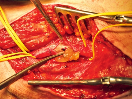 Cystisk degeneration i adventitian ger upphov till en gelatinös bildning i hålrum (Figur 2), som kan komprimera artären och ge symtom i form av artärinsufficiens [5, 6]. Det finns beskrivet i flera artärer men helt dominerande är a poplitea. Det första fallet beskrevs i Sverige 1954 av ortopeden Tor Hierton och internmedicinaren Börje Ejrup [7]. Innehållet i cystan påminner om innehållet i ganglier och har också vissa biokemiska likheter med ledvätska. Patogenetiska mekanismer som föreslagits är mikrotrauma, regelrätt ganglionbildning, myxomatös degeneration av adventitian eller kvarvarande synoviala celler med vätskeproduktion.
