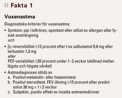 I GINA 2002 har sjukdomen en tydlig definition, och diagnostiska kriterier har angivits. Med utgångspunkt i denna rapport ges i Fakta 1 mer detaljerade förslag till diagnostiska kriterier. Noggrant definierade kriterier blir viktiga då tillstånd med liknande symtomatologi ska särskiljas. Astmadiagnostiken är grundläggande för utredning av alla typer av variabla och långdragna luftvägssymtom.