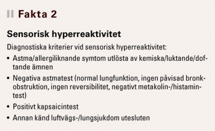 Sensitivitet och specificitet av testet har ingående studerats, och man kan idag dra ganska skarpa gränser mellan normal och onormal kapsaicinkänslighet [20, 26, 27]. De diagnostiska kriterier (Fakta 2) som satts upp är anamnes på överkänslighet i luftvägar för kemiska/luktande ämnen samt positivt kapsaicintest. Fortsatta studier får utvisa om även kyla, temperaturväxlingar och fysisk ansträngning kan ingå i kriterierna. Denna typ av överretbarhet kan, liksom IgE-förmedlad allergi, förekomma i både övre och nedre luftvägar, liksom i konjunktiva. De afferenta nervimpulserna leds via trigeminus (övre luftvägar) och vagus (nedre luftvägar).