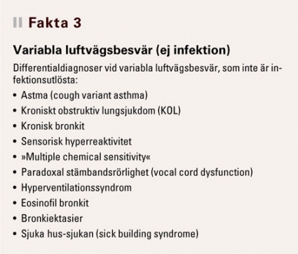 Ett mindre vanligt, men ofta omskrivet, tillstånd är paradoxal stämbandsrörlighet (vocal cord dysfunction), vilket kännetecknas av att stämbanden adduceras (i stället för att abduceras) vid inspiration och därmed ger upphov till stridor och försvårad andning. Detta kan observeras vid laryngoskopi. Utlösande faktor kan bla vara fysisk ansträngning. Övriga differentialdiagnoser finns upptagna i Fakta 3. Det är viktigt att påpeka att överkänslighet för kemiska/luktande ämnen också kan utlösa besvär från andra organ såsom övre luftvägar, ögon och CNS. Presentationen i denna artikel är inriktad mot nedre luftvägar. I Fakta 2, 4 och 5 ges förslag till diagnostiska kriterier för sensorisk hyperreaktivitet, astmaliknande tillstånd/funktionell andningsrubbning och kronisk hosta.