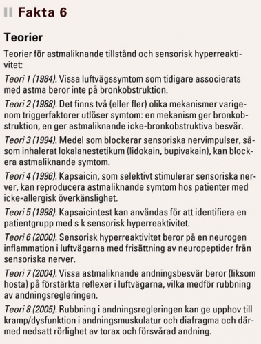 I början av 1980-talet utfördes studier av sambandet mellan subjektiv (anamnestisk) och objektiv hyperreaktivitet (påvisad med histamin- och metakolintest) [10, 11]. Dessa studier visade att känsligheten (symtompoäng) för fysisk ansträngning korrelerade med metakolintestet, medan korrelationen mellan symtom från luktande/doftande ämnen och metakolintestet var obefintlig. Dessa studier var utgångspunkten för beskrivningen av det astmaliknande tillståndet, funktionell andningsrubbning och för teorin (Fakta 6) att triggerfaktorer kan utlösa såväl bronkobstruktiva som icke-bronkobstruktiva besvär [42, 43]. Astmaliknande tillstånd har senare studerats i tre doktorsavhandlingar [44-46].