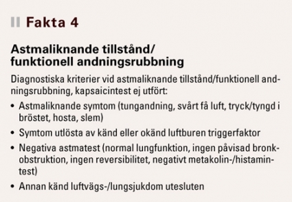 Astma är en välkänd sjukdom som kännetecknas av sammandragning av luftrören med åtföljande andningsbesvär. Vanligaste differentialdiagnoser bland vuxna är kroniskt obstruktiv lungsjukdom och astmaliknande tillstånd (funktionell andningsrubbning), varav sensorisk hyperreaktivitet är ett avgränsbart tillstånd. Förslag till diagnostiska kriterier finns i Fakta 1–5. Av olika triggerfaktorer torde allergener vara den enda som enbart utlöser bronkobstruktion (allergisk astma), övriga triggerfaktorer torde kunna utlösa både bronkobstruktion och astmaliknande (icke-bronkobstruktiva) symtom.