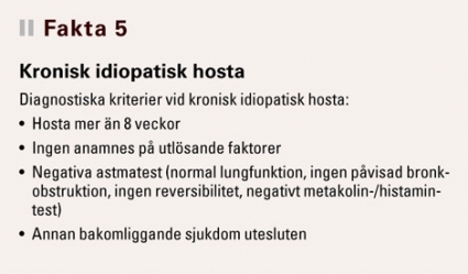 Kronisk hosta har ingående studerats av Lennart Hansson [18]. Typ av kronisk hosta torde vara olika vid olika specialistmottagningar. Vid en lungmottagning kunde bakomliggande faktorer fastställas i 68 procent [18]. Hos patienter remitterade till en astma–allergimottagning kan någon av nämnda bakomliggande faktorerna sällan påvisas. Här ses framför allt två typer av kronisk hosta: dels idiopatisk hosta, där patienten inte kan peka på några utlösande faktorer, dels en form som kan kallas sensorisk hosta, där hostan enbart utlöses av triggerfaktorer (kyla, temperaturväxling, fysisk ansträngning, kemiska/luktande ämnen mm). Det finns ett spektrum av symtom. En och samma triggerfaktor (tex ett luktande ämne) kan hos den ena patienten utlösa hosta, hos den andra andningsbesvär. I båda fallen finner man som regel ett positivt kapsaicintest (sensorisk hyperreaktivitet).