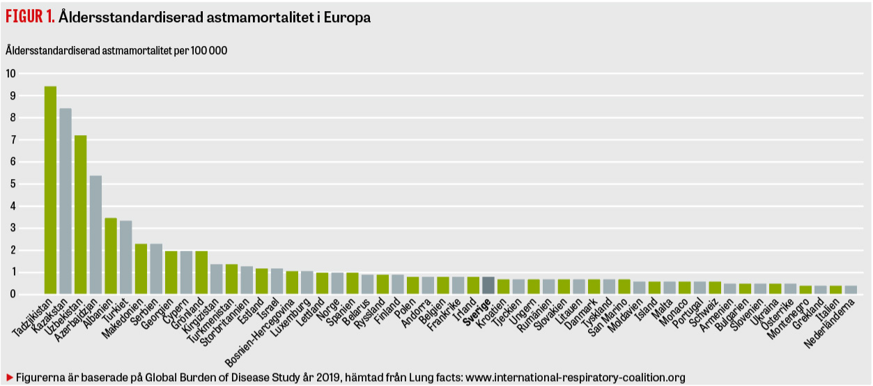 Trenderna i prevalens, incidens och remission av astma har varierat över tid, och mönstren har påverkats av faktorer såsom förändringar i livsstil och miljö och socioekonomiska förhållanden, men också förbättrad diagnostik, behandling och vård [1, 4]. När det gäller risk- och friskfaktorer för astma finns viss kunskap, men vi kan fortfarande inte helt förklara varför vissa individer drabbas. Kunskapen är särskilt begränsad när det gäller preventiva åtgärder för att undvika utveckling av astma. I dag finns det effektiv behandling för många, om än inte alla, astmafenotyper och i Sverige har vi en mycket låg mortalitet på grund av astma (Figur 1), men det finns ännu inga läkemedel som fullt ut kan bota sjukdomen [1]. Här följer en översikt om astmaepidemiologi uppdelat i globala trender respektive nuläget i Sverige.