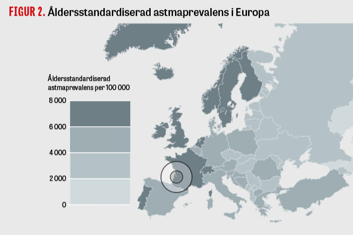 Astma är en av de vanligaste kroniska icke-smittsamma sjukdomarna globalt, både bland barn och vuxna, och den allergiska astman anses generellt vara vanligast. Allergisk astma kan debutera både hos barn och vuxna; prevalensen är oftast högre bland barn, medan den icke-allergiska astman är vanligare bland vuxna, särskilt kvinnor [5]. Det är även klarlagt att T2-driven astma är vanligare vid allergisk än vid icke-allergisk astma [2, 3] och relativt ovanlig bland individer med vuxendebuterad astma [6]. I dagsläget saknas dock större prevalensstudier av T2-driven respektive icke T2-driven astma. Att beräkna exakt prevalens är svårt, eftersom tillgång till sjukvård, diagnoskriterier, behandlingsriktlinjer och den generella medvetenheten om sjukdomen har skiljt sig åt både över tid och mellan olika geografiska områden [4]. Det finns relativt stora skillnader i astmaprevalens mellan olika länder. Historiskt har prevalensen varit lägre i låginkomstländer och högre i exempelvis Storbritannien, i före detta brittiska kolonier och i de nordiska länderna [7], vilket även åldersstandardiserade data från Global burden of disease study 2019 bekräftar (Figur 2). Baserat på multicenterstudier som har använt samma frågeformulär har prevalensen av astmasymtom bland barn beräknats till cirka 10 procent under åren 2015–2019, men med stor geografisk variation [8]. Bland vuxna har man exempelvis beräknat att prevalensen av astma är ≥9 procent i Västeuropa och de nordiska länderna, medan den uppskattats till <3 procent i Östeuropa [9]. En tydlig generell trend i Europa är att prevalensen är högre i urbana områden än i glesbygd [4, 5, 7-10], vilket även visats i studier från exempelvis Nigeria [11], Kina [12] och Indien [13]. Under de senaste årtiondena har astmaprevalensen ökat i ett flertal låg- och medelinkomstländer, särskilt i delar av Asien, Afrika och Latinamerika [4, 7, 14-16]. I många höginkomstländer, inklusive USA och i Västeuropa, ökade prevalensen av astma kraftigt under senare delen av 1900-talet, parallellt med en ökning av allergier, för att därefter ha stabiliserats eller till och med minskat något [14-21].