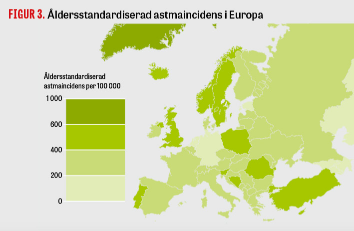 Det är komplicerat både att beräkna och att jämföraincidensen av astma mellan olika områden och över tid, eftersom estimaten beror så starkt på ett flertal faktorer såsom ålders- och könsfördelning i urvalet, uppföljningstidens längd, definitionen av astma och huruvida studierna är populationsbaserade (baserade på slumpurval från befolkningen) eller registerbaserade respektive retrospektiva (tillbakablickande) eller prospektiva (framåtblickande). Prospektiva studier tenderar att ge något högre estimat än retrospektiva, men estimaten varierar kraftigt. Incidensen bland barn och ungdomar har beräknats till 7–30/1 000/år [15, 22-24], jämfört med cirka 0,2–5/1 000/år bland vuxna [25-29]. Bland barn är incidensen högre bland pojkar än flickor, men detta förändras efter puberteten [30], och incidensen bland vuxna är högre bland kvinnor än män [15, 31]. Europeiska data från Global burden of disease study 2019 visar att även incidensen av astma har varit hög i Västeuropa och i de nordiska länderna (Figur 3). Incidensen av allergisk astma är högst under barndomen, medan incidensen av icke-allergisk astma är högst hos vuxna [26]. I vissa höginkomstländer har incidensen av astma legat stabilt på en relativt hög nivå de senaste årtiondena [32] eller tenderat att minska något, särskilt bland barn [22, 24, 32-35].