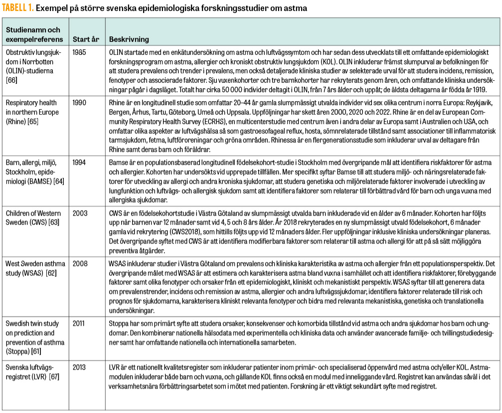 Ur ett internationellt perspektiv var Sverige tidigt ute med befolkningsstudier med fokus på astma. I Tabell 1 presenteras, i kronologisk ordning efter studiestart, några exempel på pågående svenska epidemiologiskaastmastudier [61-67]. Mer information finns på webbplatsen Andas Sverige (breathesweden.com).