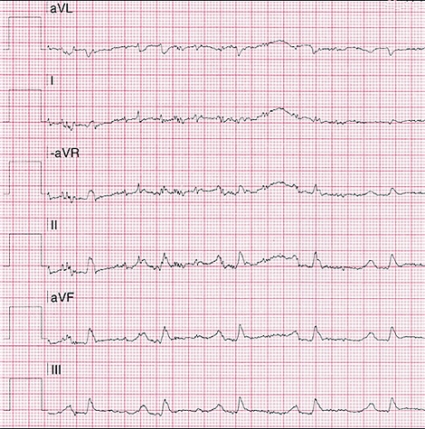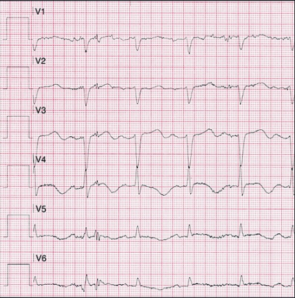 Vid ankomsten till sjukhuset var patienten smärtpåverkad, systoliskt blodtryck var 90/60 mm Hg, puls 96/min, och i status noterades dyspné och rassel över lungorna. EKG visade dålig R-vågsprogression, ST-sänkningar och T-vågsnegativitet (Figur 1).