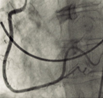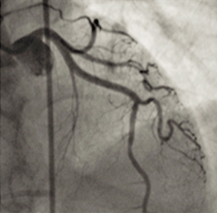 Till vår stora förvåning visade angiografin inga signifikanta stenoser (Figur 2) eller andra uppenbara tecken på akut koronarsyndrom. Flödet i LAD (främre nedåtstigande grenen av vänster koronarartär) var något långsammare än normalt, men för övrigt såg vi inget anmärkningsvärt.