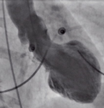 På grund av diskrepansen mellan patientens symtom och undersökningsfynden utfördes en ventrikulografi som uppenbarade ett, för oss, överraskande fynd (Figur 3). Den visade att de apikala delarna av hjärtat var akinetiska trots att de resterande basala delarna av hjärtat var hyperkinetiska.