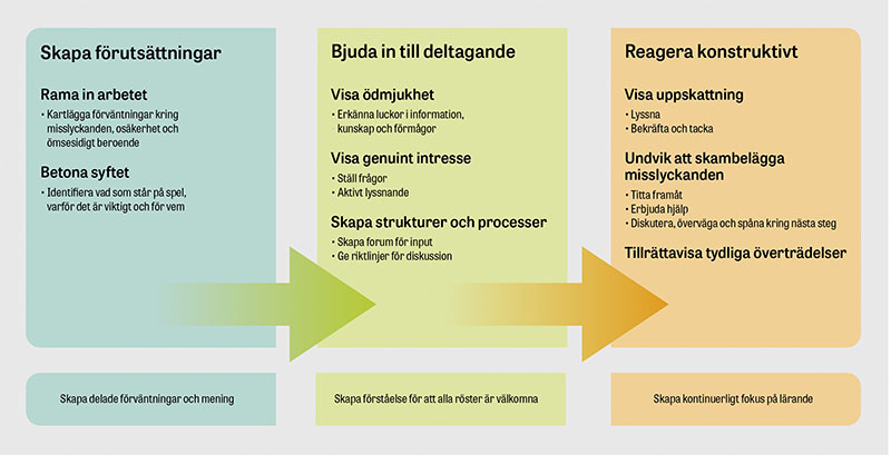 Vissa ledaregenskaper har visat sig främja psykologisk trygghet: autenticitet, öppenhet, en tydlig moralisk kompass och en ledarstil som förstärker medarbetarna genom att visa tillit och skapa delaktighet [14]. Dessa är egenskaper som framgångsrika ledare inom läkarkåren besitter [15] och som har visat sig bidra till positiva effekter för vårdorganisationer med avseende på hälsoutfall, patienters upplevelse, ekonomi och personalens välbefinnande [16]. Forskning har också identifierat beteenden hos ledare som bidrar till psykologisk trygghet. Det handlar om hur man riktar sin uppmärksamhet, lägger märke till medarbetarnas välmående, tar sig tid att diskutera deras bekymmer samt ger uppriktiga och opartiska svar [14, 17]. Saknas dessa viktiga beteenden hos individer i ledarroll kan satsningar på teamsamverkan eller träning i psykologisk trygghet vara värdefulla [8, 10, 18]. Edmondson beskriver tre kategorier av verktyg som ledare bör arbeta med i sina medarbetarinteraktioner (Figur 1).