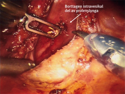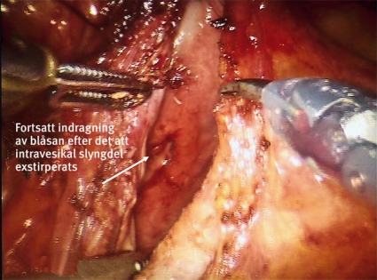 På grund av lokalisationen planerades för operation med robotassisterad laparoskopisk teknik; tre robottroakarer och en assistenttroakar användes. Blåsan mobiliserades genom dissektion ner i cavum Retzii, varefter cystotomi utfördes i blåstaket. Den intravesikala delen av slyngan frigjordes och lyftes ut i påse (Figur 1, 2). Eftersom blåsan fortfarande kunde »dras« ut i en strut av den extravesikala delen av slyngan (Figur 3), dissekerades även denna fram och exstirperades, inklusive den bit som satt i själva blåsväggen (Figur 4). De bägge blåsincisionerna suturerades, och patienten hade öppen KAD i 1 vecka.