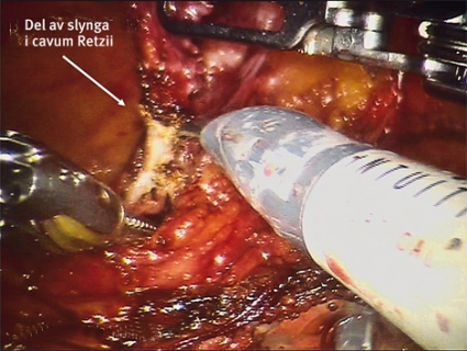 Vid uppföljande telefonsamtal var allt väl och ansträngningsläckaget borta, men någon månad senare angav hon sipprande läckage nattetid och smärta vid miktion vid enstaka tillfällen. Ny urodynamik var helt utan anmärkning. Utredning visade stora urinmängder nattetid och dåligt reglerad diabetes som förklaring till det eventuella läckaget. En cystoskopi gjordes dock, vilken visade att en del av slyngan satt intravesikalt på vänster sida på platsen för den ursprungliga perforationen. Patienten opererades i narkos. Med översikt via ett 70-graders cystoskop sattes två 5 mm laparoskopitroakarer in i blåsan suprapubiskt. Slyngan sträcktes via en griptång och klipptes med sax via den andra troakaren.