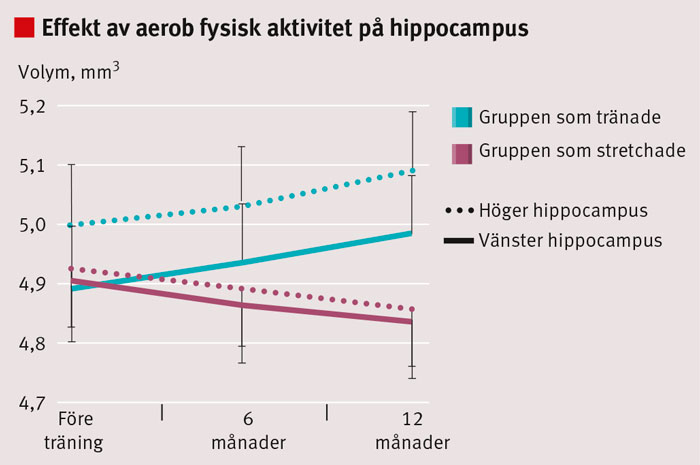 Det finns ett starkt positivt samband mellan aerob kapacitet och kognitiv funktion, vilket visats i bl a svenska mönstringsstudier [36]. Storleken på hippocampus, en hjärnstruktur med stor betydelse för bl a arbetsminne och rumsligt minne, är relaterad till aerob kapacitet och minnesfunktion [37] och ökar i storlek parallellt med förbättrat minne efter 1 års regelbunden aerob fysisk aktivitet [38] (Figur 1).