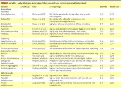 Eftersom läkarnas upplevelser av arbetsklimat och välbefinnande står i fokus för undersökningen ter sig självrapporterade data som naturliga. Data insamlades med hjälp av enkäter, eftersom de ger möjlighet att mäta sådana upplevelser för stora grupper av personer. Etablerade mått, varav de flesta har validerats i tidigare studier, användes. Samtliga mått uppvisade god reliabilitet. För utförligare beskrivning av måtten, se Tabell I.