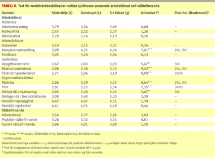 Ett resultat som visar en signifikant multivariat effekt av driftsform innebär att läkarna på de tre sjukhusen överlag upplevde sitt arbetsklimat och välbefinnande på olika sätt. För att närmare kunna studera vilka aspekter som eventuellt skilde sjukhusen åt genomfördes även uppföljande univariata F-test. För att identifiera exakt mellan vilka sjukhus skillnaderna fanns gjordes dessutom kompletterande post hoc-test (Bonferroni). Denna typ av post hoc-test är särskilt lämplig när det gäller att identifiera skillnader mellan relativt få grupper.