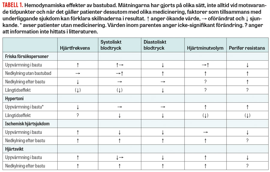 Ett finskt bastubad på upp till 20 minuter leder till nästan 39 graders kroppstemperatur, kutan kärldilatation, cirka ett halvkilos viktnedgång genom svettning, ökning av hjärtfrekvens och sänkt perifer resistans [12, 13]. Hos unga friska försökspersoner förblir det systoliska blodtrycket oförändrat [14] eller stiger tillfälligt [9] i bastun medan det diastoliska sjunker (Tabell 1). I en grupp individer med potentiella riskfaktorer för kardiovaskulär sjukdom, varav många med behandling mot hypertoni, hyperkolesterolemi eller diabetes, sjönk däremot såväl systoliskt som diastoliskt blodtryck under minst en halvtimme efter bastubad samtidigt som hjärtfrekvensen ökade tillfälligt [15]. Även hos patienter med obehandlad hypertoni sjunker blodtrycket efter ett bastubad, en effekt som varar upp till två timmar [16].