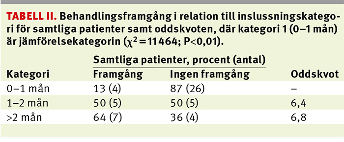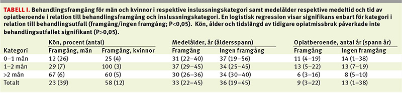 Ålder för män och kvinnor i respektive inslussningskategori liksom ålder och längd av opiatberoende i relation till behandlingsframgång och inslussningskategori visas i Tabell I. Den logistiska regressionen visar ett signifikant utfall (P < 0,05) men endast gällande kategori i relation till behandlingsframgång och inte för de andra ingående parametrarna (kön, ålder och antal år med opiatberoende). Inslussningskategori 2 och 3 skilde sig båda signifikant från kategori 1 (P < 0,05). Den sammanräknade behandlingsframgången i relation till inslussningskategori för samtliga patienter tillsammans med erhållna oddskvoter visas i Tabell II.