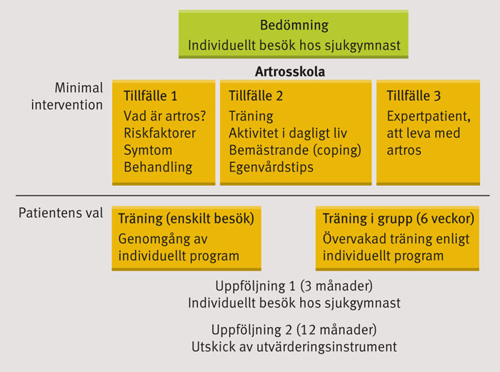 Artrosskolan utgörs av en »minimal intervention« som bedrivs på liknande sätt på alla enheter (Figur 1). Skolan leds av sjukgymnast och på vissa håll även av arbetsterapeut, båda med speciell utbildning i och gedigen kunskap om artros. Innehållet omfattar information om vad artros är, riskfaktorer, tillgängliga behandlingar och egenvårdstips. Dessutom inkluderas ett teoritillfälle som leds av en »expertpatient«, dvs en patient som utbildats i att tala om sina erfarenheter av fysisk aktivitet för att kunna leva ett gott liv med artros. Syftet är att artrosinformatören, som medverkar ideellt, ska vara det goda exemplet och att deltagare i artrosskolan ska kunna identifiera sig med den som ger råd och rekommendationer.