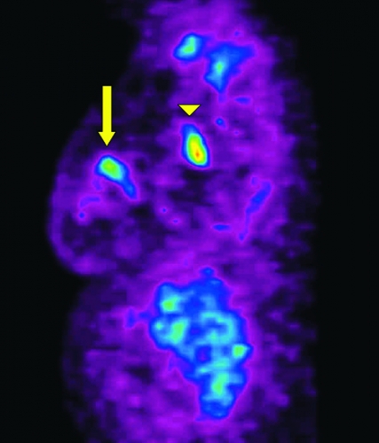 En 52-årig kvinna sökte för obehag i höger bröst, och palpatoriskt fann man endast viss svullnad. Mammografi och ultraljud visade inget anmärkningsvärt. Ultraljudsundersökning av höger axill visade en 36 mm stor lymfkörtel. Fluorodeoxiglukos(FDG)-PET-undersökning visade tydligt metabolt upptag i bröstet samt upptag i höger axill men inga tecken på fjärrmetastaser (Figur 1A och B). Biopsier från axill och bröstet visade invasiv duktal cancer. Patienten inkluderades i en neoadjuvant cytostatikastudie, där man utförde lungröntgen, ultraljud lever och skelettskintigrafi utan några patologiska fynd. Detta var således ett fall som presenterade sig som CUP, men med hjälp av modern diagnostik erhölls en specifik tumördiagnos.