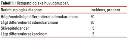 Histopatologiskt är adenokarcinom i särklass vanligast, varav de flesta är högt eller medelhögt differentierade. Skivepitelcancer och odifferentierad cancer är ovanligare (Tabell I). Efter ytterligare histopatologiska specialanalyser kan specifik undergrupp fastställas i ca 15 procent av fallen (Tabell II) [17].